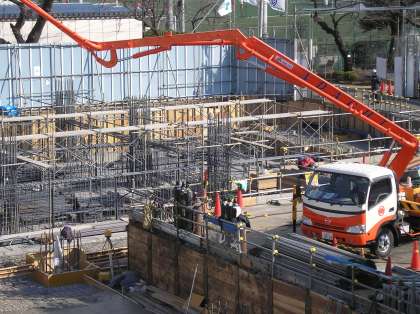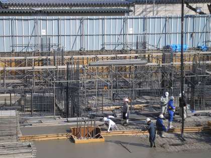 建物の基礎部分に敷いた鉄筋の上にコンクリートが