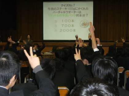 はじめに餃子、チキンカレーに必要な材料について、何人かの生徒に質問をし、その材料で輸入量の多いものを答えるクイズが行われました。生徒たちは生き生きとした表情でクイズに参加していました。