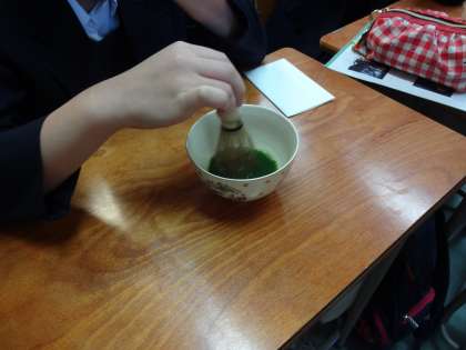 茶道では、先生のお点前を見学し、教室で季節の和菓子と御抹茶をいただきました。