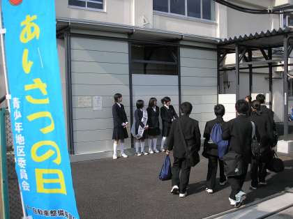各門に生徒会役員と生活委員が立ち、登校してくる生徒に元気よく