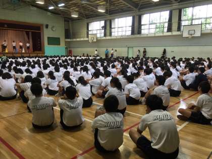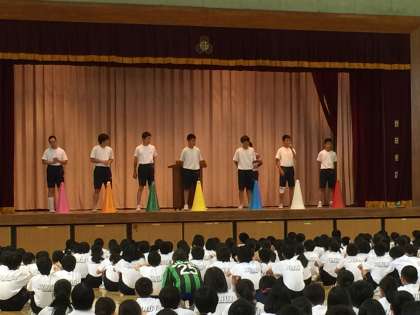 今年度初の運動会全体練習は、体育館で始まりました。応援団長そろい踏みです。
