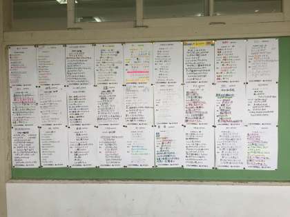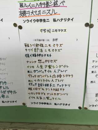 1年生の廊下では、教科「日本語」で学習した雨ニモマケズに関連して、自分なりの〜マケズの展示をしています。個性あふれる作品ばかりです。