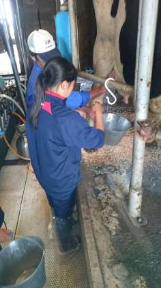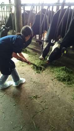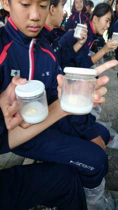 乳搾りに、牧草の餌やりを体験しました。そのあと、バター作りに挑戦です。