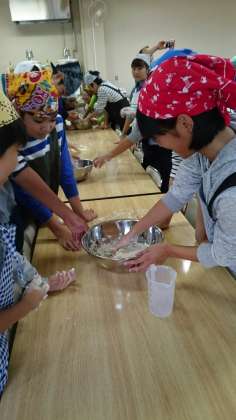 宿舎に、着きました。早速、食堂で、うどん作りです。恐る恐るこねだしましたが、段々慣れて形になってきました。