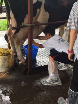 B組は乳搾り体験。男子も少し腰が引けてます。感想が楽しみです。