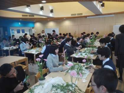 先週の茶道体験教室に続いて、生け花体験しています。ボランティアの先生方の指導のもと、真剣に楽しく、体験中です。