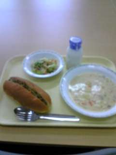 ドライカレーサンド、クラムチャウダー、サラダ、牛乳 です。生徒にはなかなかの人気でした。
