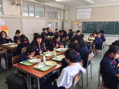 初の給食はカレー、小学校と比べてとかどうとか、班の仲間との会話を楽しみながら食べました。