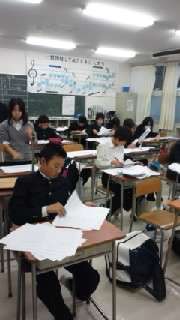 写真は、皆さんが書いたアンケートを放課後に学発委員会が集計している様子です。