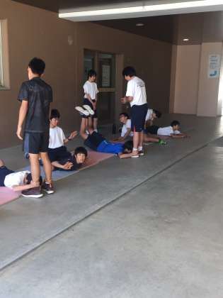 陸上競技部は1年生だけの練習です。基本のドリルから始まり最後の体幹強化。疲れを吹っ飛ばすように「限界突破」と、みんなで大声で盛り上げてます!