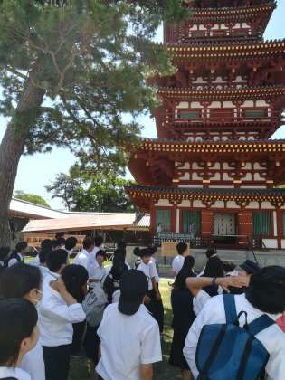 A組がガイドさんの話をしっかりと聞いています。