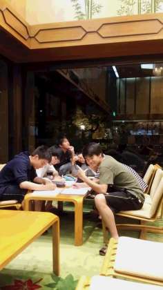 自由時間を使って、明日の行動確認をする班も。事前学習、念には念を入れて。
