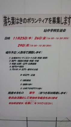 生徒会では1、2年生対象に、落ち葉はきのボランティアを募集しています。