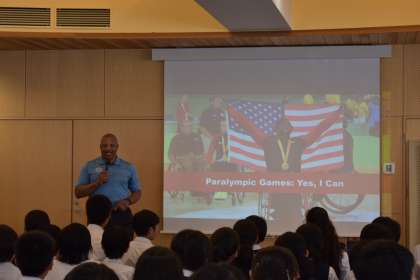 本日の5時間目、シドニーパラリンピックで活躍した、パラリンピアンのジョン・レジスター氏をお招きして、講演をしていただきました。