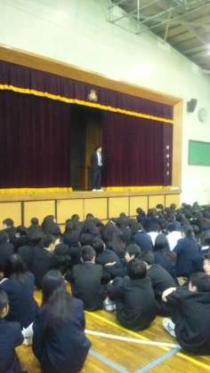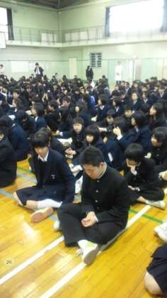 雨天のため、廊下で点呼をしてから、体育館に集合しました。