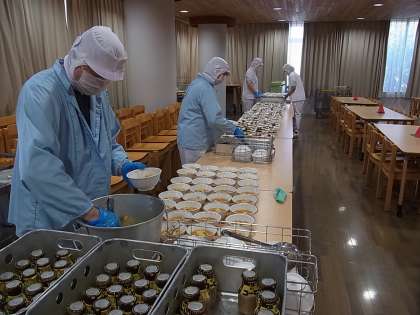 (左)特別なランチルーム給食。生徒のために料理を盛り付けてくれています。
