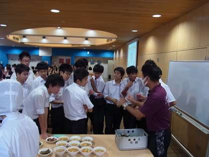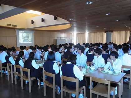 4限が終了する前に、調理さんが給食を準備してくれます。生徒は社員食堂のようなイメージで料理を調理さんから受け取ります。普段交流がしにくいので、お互いこういった機会に親睦を深められたらいいなと思っています。