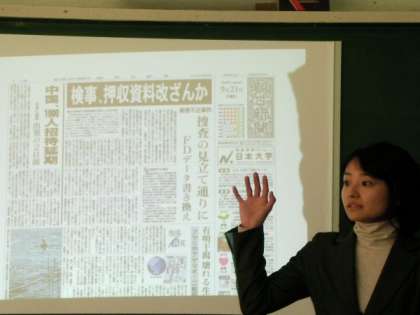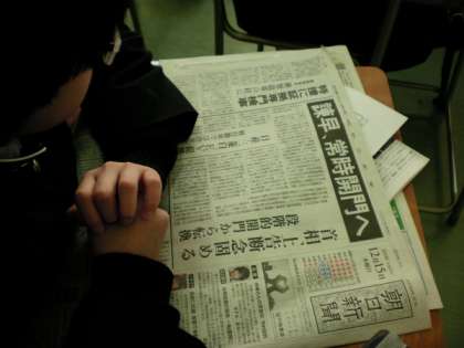 昨日・今日の2日間にわたり、1年生の社会科の授業で、「新聞の読み方」の授業を行いました。朝日新聞社の林 知聡(はやしちさと)さんから、「新聞ができるまでと新聞社の仕事」や「新聞記事の特徴」などについてお話を伺いました。事前のアンケートで生徒たちが出した質問にも答えていただき、難しい新聞が身近になりました。実際に本日の朝刊などを「パラパラ読み」する生徒たちは、とても楽しそうでした。