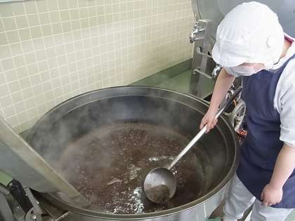 (左)あずきを煮ています。丁寧にあくとりしています。