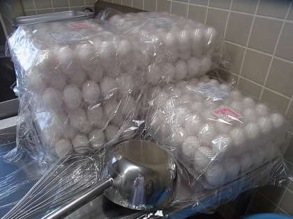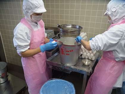 (中央)ひとつひとつたまごの殻が入らないよう点検しながら割ります。