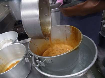 朝から手作りプリンの準備にとりかかっています。プリンの蒸し時間は40分かかるので、朝どれだけ手際よく作業を進められるかが給食室では重要になります。材料はたまご、牛乳、生クリーム、さとうとほんの少しのバニラの香りのみ。シンプルな材料で作ります。