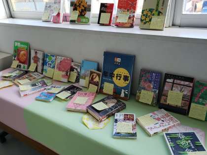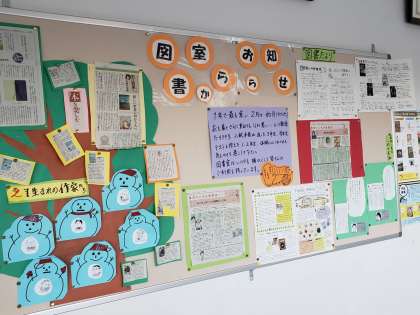 職員室前の図書室掲示板と出前図書室のコーナーは