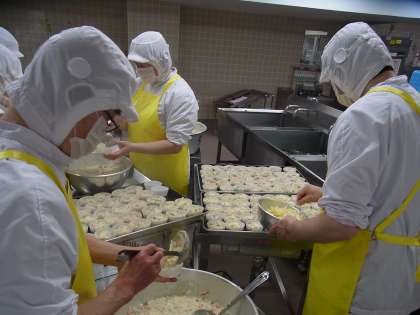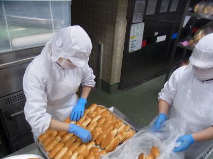(左)バイキング用の小さいパンをきれいに盛り付け中。