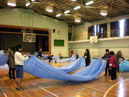 災害時に体育館が避難所になることを想定して、実際に床にブルーシートを配置したり、防災倉庫の物品に色分けシールを貼り付けたりしました。また、班ごとに様々な課題を話し合いました。