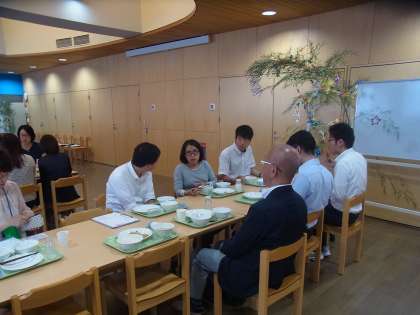 今回、学び舎の小学校の保護者の方もお見えになり、総勢66名のご参加となりました。炭酸飲料について、熱中症の対応、朝食の取り方など、保護者の方からの質問に答える形で養護教諭と栄養士から話をさせていただきました。その後、本校給食の説明と試食という流れで進みました。
