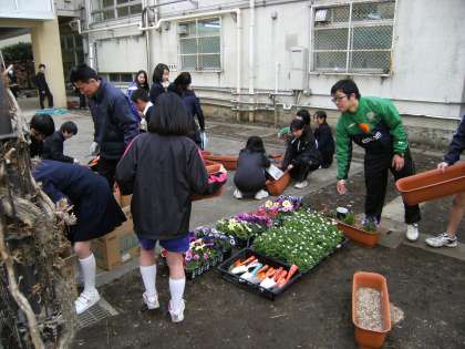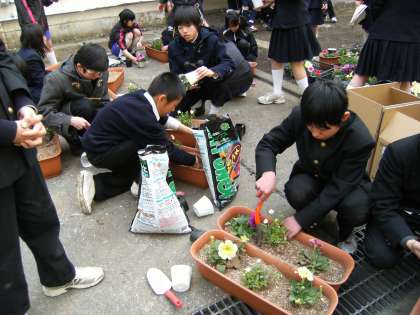 また放課後には、1年のエコ委員と有志によってプランター鉢植え作業を行いました。前回のパンジー植えに引き続き、作業している生徒からは、楽しいという声が聞かれました。生徒の気持ちとともに鉢植えの花々もすくすくと育ってほしいですね。