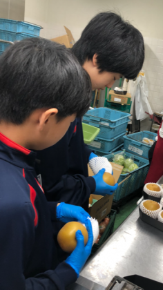 青果のラッピングの仕事を体験しています。
