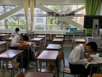 登校した生徒たちが自習(宿題かな?)を。
