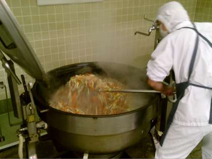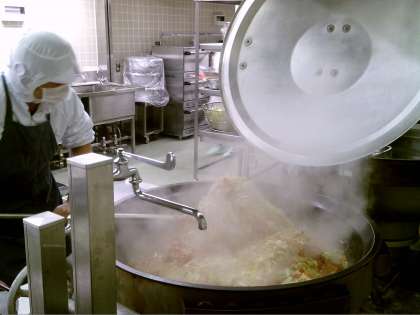 (上)大量の湯気の中、豚キムチを炒める調理スタッフ。