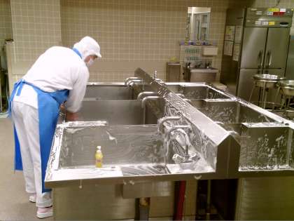 (下)野菜洗浄のシンクを泡一杯丁寧に洗浄しています。