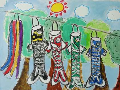 5月6日(金)、校外学習で次大夫堀公園に行き、こいのぼりの写生をしてきました。次大夫堀公園は砧中から徒歩10分くらいのところにあります。毎年この時期に20尾ほどの鯉のぼりが飾られるので、I組では毎年校外学習で写生をしに行きます。新緑を背景に悠々と泳ぐ鯉のぼりを一生懸命クレヨンと水彩絵の具を使って写生しました。生徒たちは、紙いっぱいに力強く泳ぐ鯉のぼりをカラフルな色遣いで描くことができました。