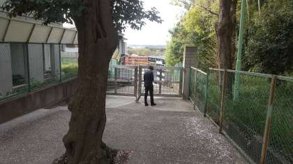 南門は桜の花びらが美しく散っています。来年の桜は皆さんと笑顔で見られることを願って、掃除しています!