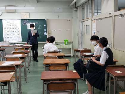 学級担任の説明の後は、各教科担任が教室を回り、それぞれの課題を説明します。その際、個別の相談も受けています。配布資料が多く、大変だと思いますが、一つひとつの課題を計画的に取り組んでくださいね。