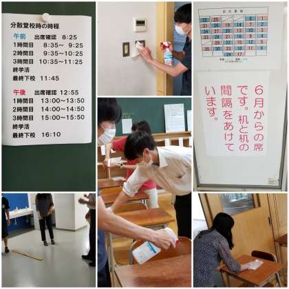 いよいよ、新学期のスタートです。分散登校に向けて、感染拡大予防対策をしています。教室の机や椅子等の消毒、水道前やトイレのソーシャルディスタンスの確保、石鹸やハンドソープの補充、座席の方向や位置の確認等、学年全体で気を付けて取り組んでいます。皆さんと会えるのを楽しみにしています。