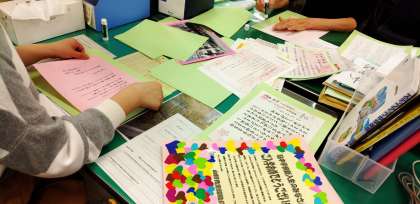 小学校から届いたお祝いメッセージを台紙に貼ったり、