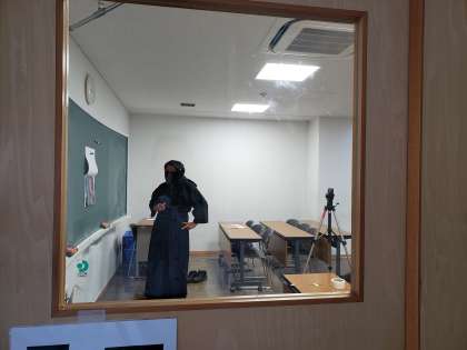 多目的室の前を通りかかった生徒のみなさん、驚かないでくださいね。3年生の社会科動画撮影中でした。「どうして忍者?」
