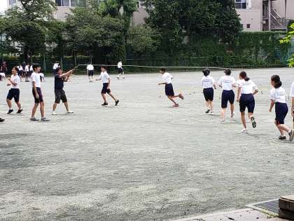この期間限定の男女一緒の体育の授業。大縄跳び、自分がミスしないよう緊張の中ての跳躍てす。