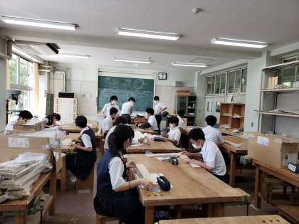 2年生技術、木工製作。まずは製図を書いて、それから作業に入ります。製図通りに作品が仕上がるといいですね。