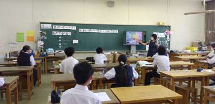 というタイトルで色について学びます。休業中の課題や配信した学習サポート動画の視聴と今日の授業がつながっています。提出した作品がテレビに映し出され友達の作品の工夫したことや良さを共有することができました。