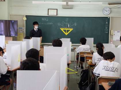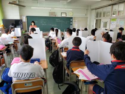 生徒からの声として最も多かったのが、黒板が見えづらいというものでした。特に1年生は視覚が遮られる生徒が多いようです。今日からは見えづらい時には、各生徒の判断で一旦パーテーションを畳んでもいいですよ、と伝えています。