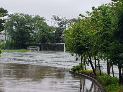 現在、学校周辺では風雨が強まっています。予報ではこの後、風雨は弱まるものと思われますが、生徒の下校時の状況により、学校で待機することも検討しております。