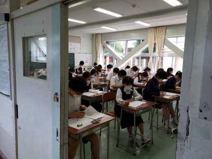 英語は恒例のリスニングテストから。英語担当が昨日まで何度も動作確認をしてきました。音量など放送での状況を廊下でも確認しています。生徒たちは落ち着いて取り組んでいるようです。