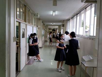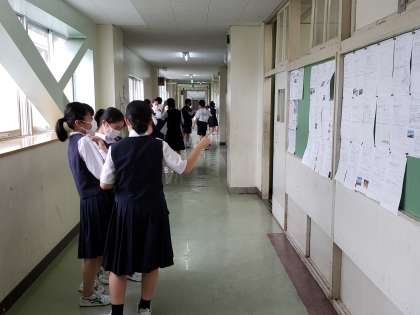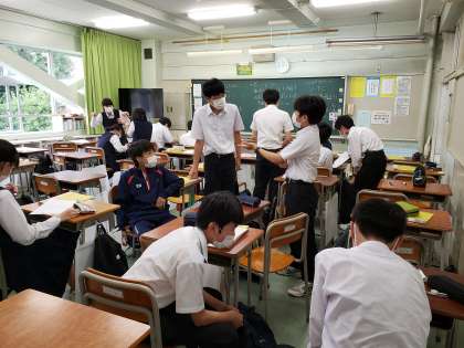 この時間、授業が無い教員が、声が外に漏れないか、他学年の授業に支障が出ないか、階段や窓の側でチェックを行っています。少しでも生徒たちの活動が活発となるよう、試行錯誤の日々です。