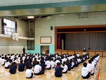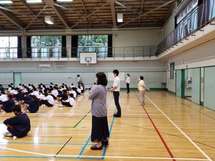 1年生は体育館で初めての学年集会を開きました。窓や扉を開放して、換気に努めながらの開催です。