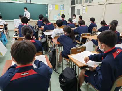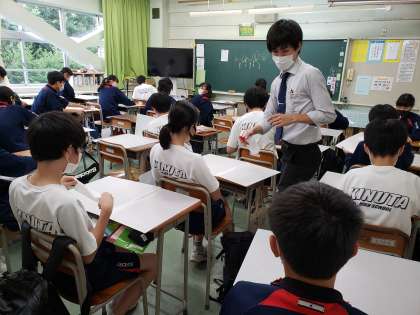 砧中では現在、生徒による清掃活動は実施しておりません。生徒たちにお願いしているのは、週2回のパーテーション消毒です。毎週水曜日と金曜日の学活終了後に行います。先生が消毒液をかけて、各生徒がペーパーナプキンで拭いていきます。