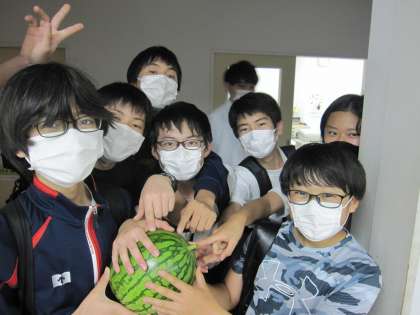 農業部の生徒たちがスイカを抱えて職員室へ